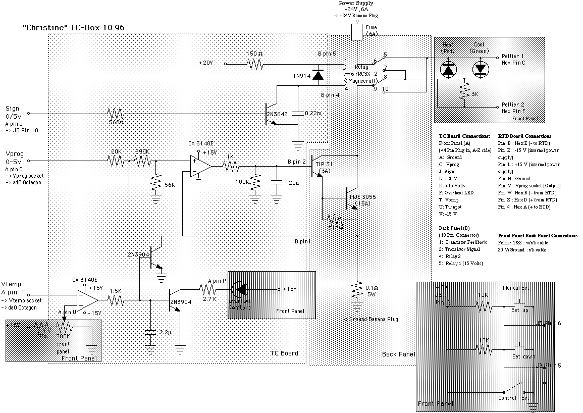 Another feature of previous designs is an adjustable resistor in the feedback mechanism for the Darlington pair. This is included to assure that a badly chosen input voltage on the op-amp can't set the current going through the system too high. Can economize here, think about the maximum input voltage well and instead add a quick blowing fuse into the path of the heaters, which is a good idea, anyway. That resistor off-set is probably the cause for the lack of thermal response at small Vprog by the way, which was investigated by S. Lee at length in his analysis of the T-control systems.